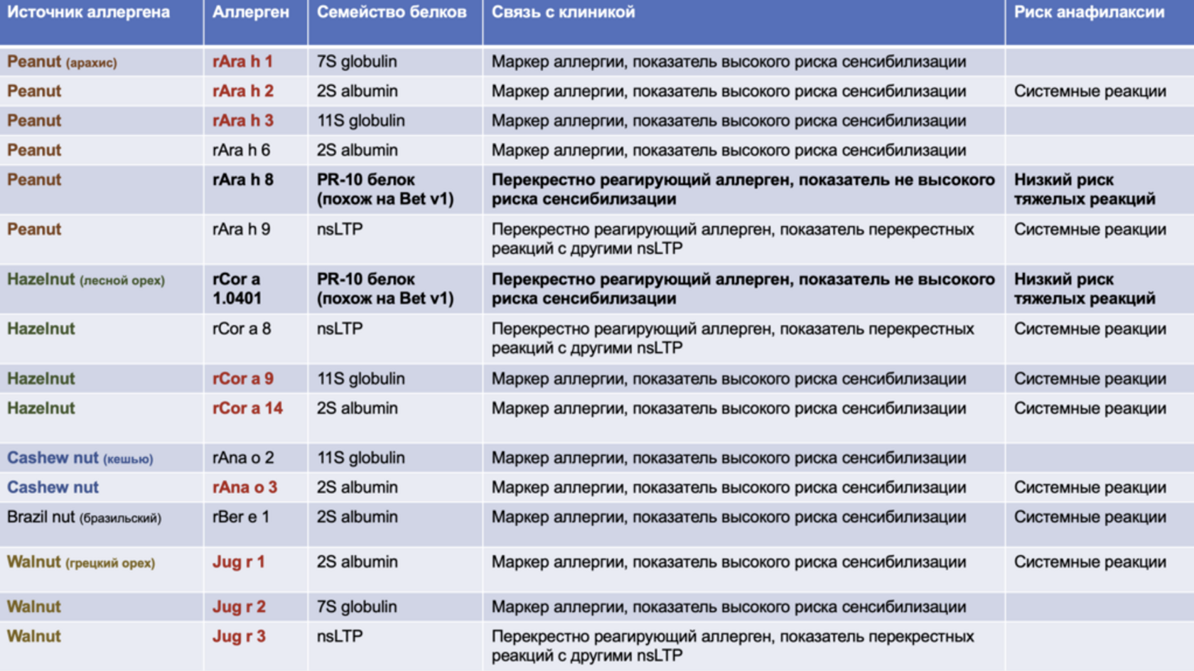 – В основной таблице первоисточника у аллергена ореха кешью представлен только один компонент, я внесла дополнительно rAna o 3, так как именно с ним связывают системные реакции, что и отражено в тексте монографии.
