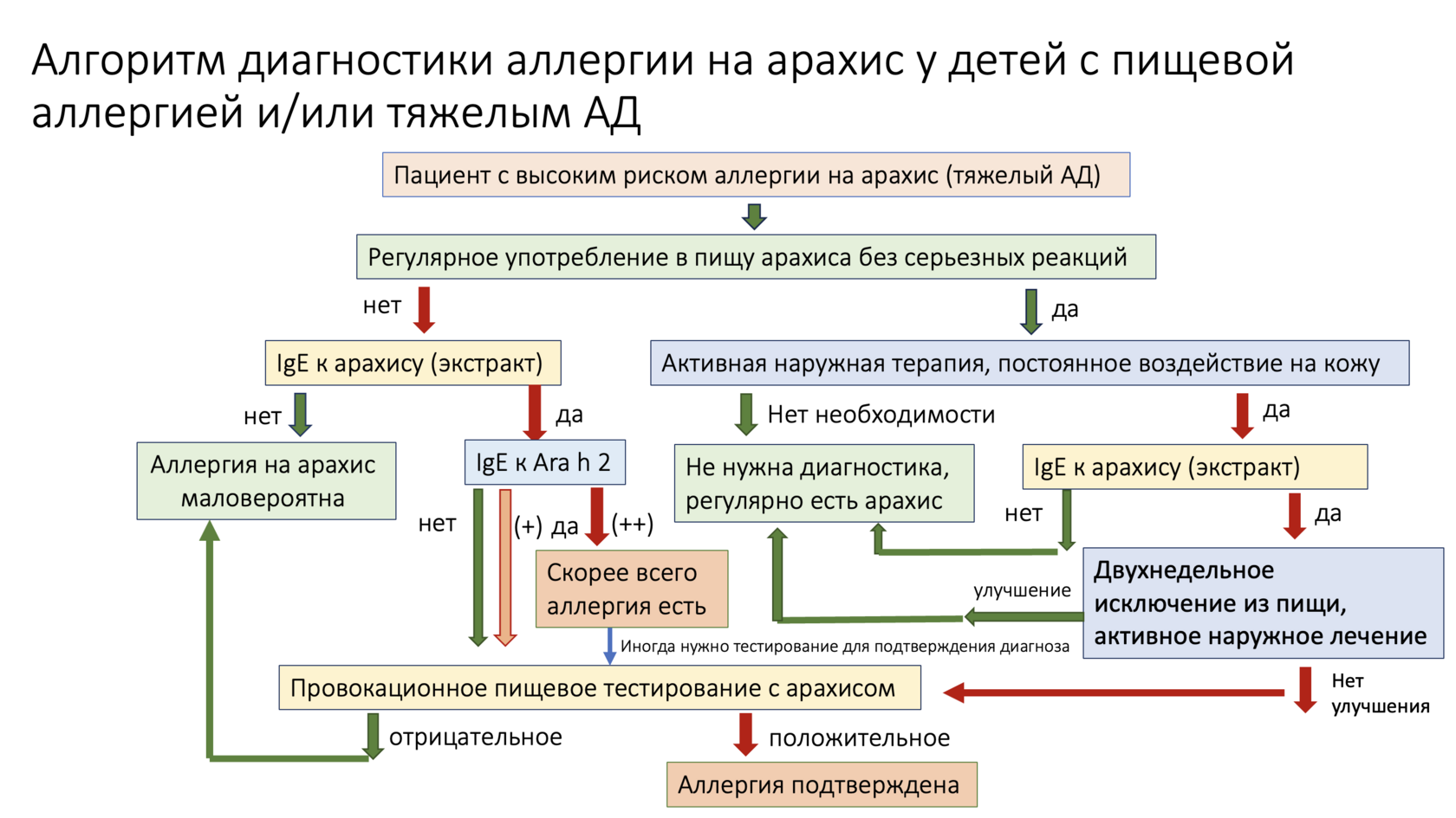 – Нередко у врачей и родителей детей с ПА и/или тяжелым (!) АД без истории аллергических реакций на арахис возникает запрос на: 1) исключить аллергию на арахис до начала его употребления в пищу , 2) оценить риски при случайном обнаружении сенсибилизации во время скрининга на аллергию и 3) изучить опасности развития тяжелой аллергии при наличии в истории ребенка контактных кожных реакций с арахисом. Существует алгоритм диагностики аллергии на арахис, я перевела его для вас с английского языка на русский.