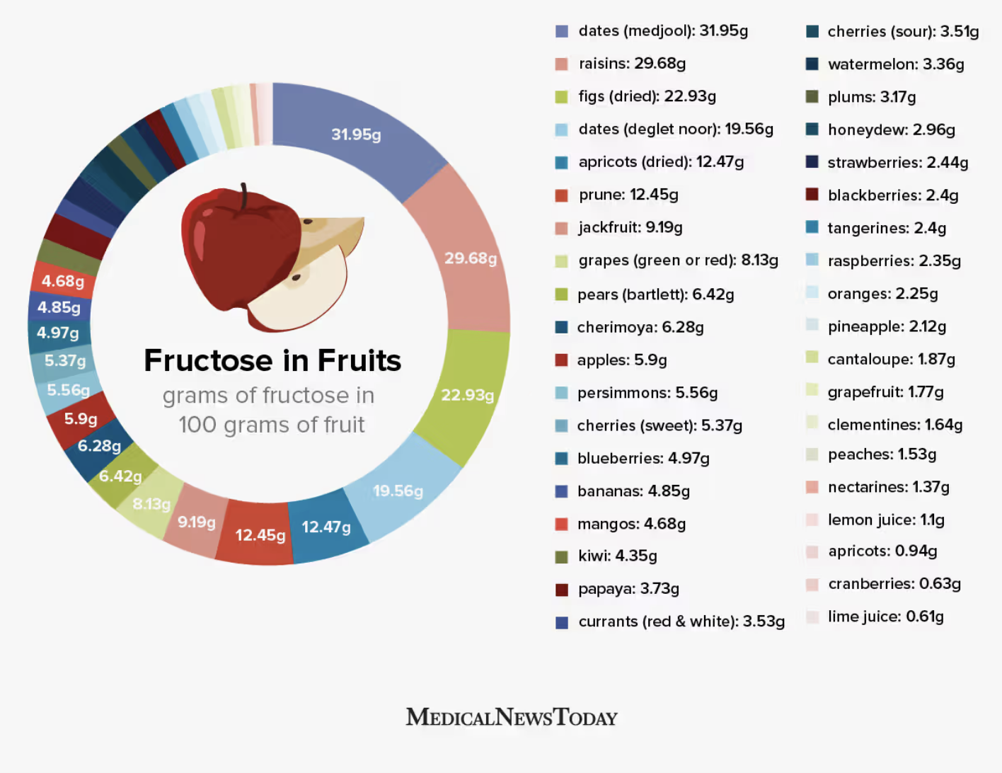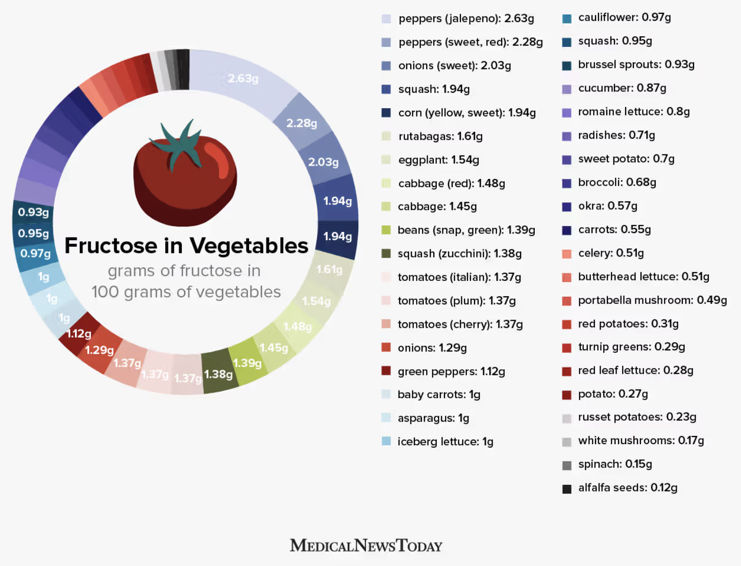 Фруктозы много в яблоках, манго, персиках, сливах, грушах, нектаринах, абрикосах, инжире, спарже, горохе, свекле, цветной и брюссельской капусте, брокколи и кукурузе (см рисунок ниже). Её часто добавляют в продукты питания и напитки – в яблочное пюре и разные соки. Поэтому появление болей в животе и диареи сразу после того того, как выпил сокосодержащий напиток также могут быть связаны с непереносимостью фруктового сахара.